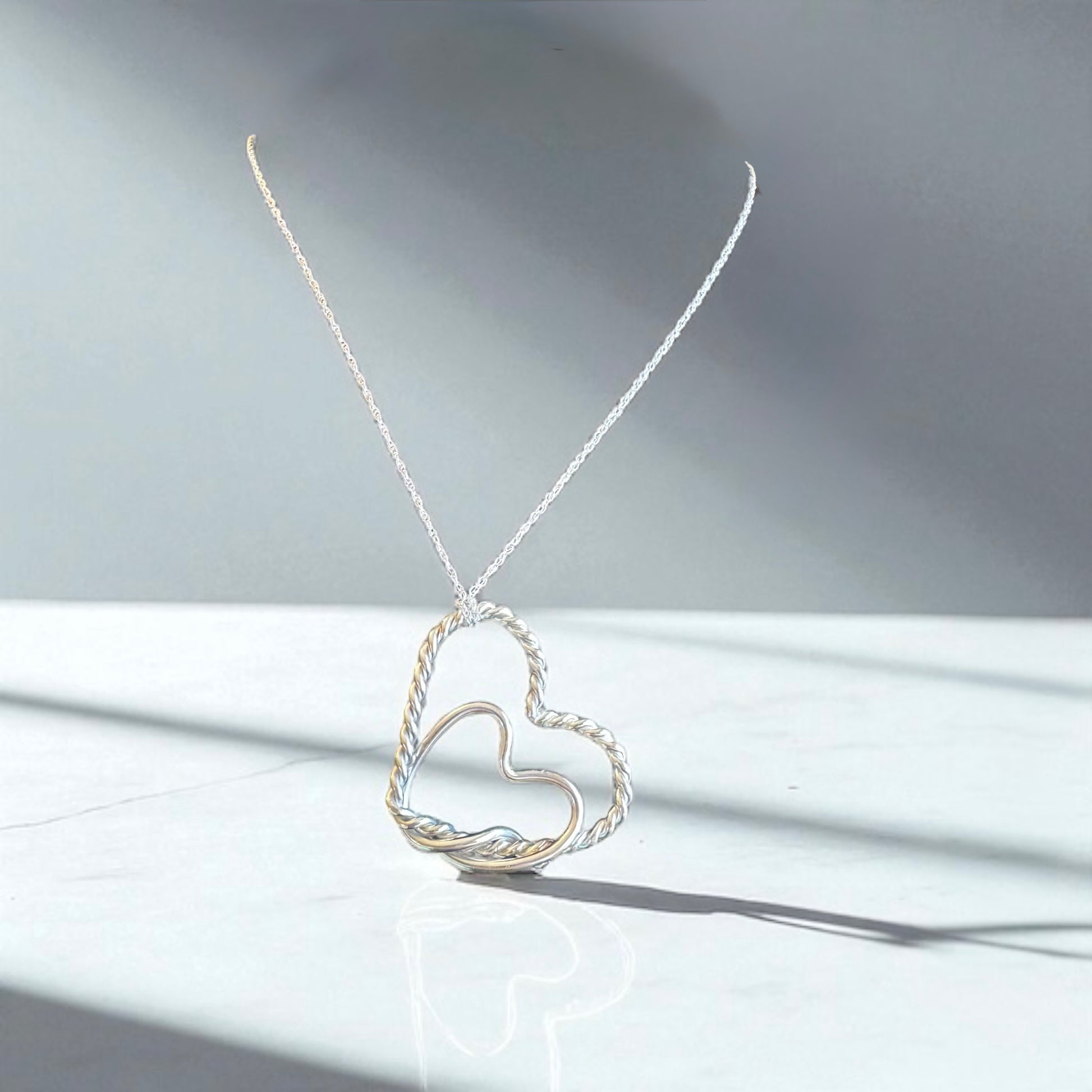 This handcrafted heart necklace is made of 2 thick twisted sterling silver wires woven together with a hammered silver small heart embracing the the other. It's a substantial piece of jewelry with a beautiful 24" sterling silver rope chain.