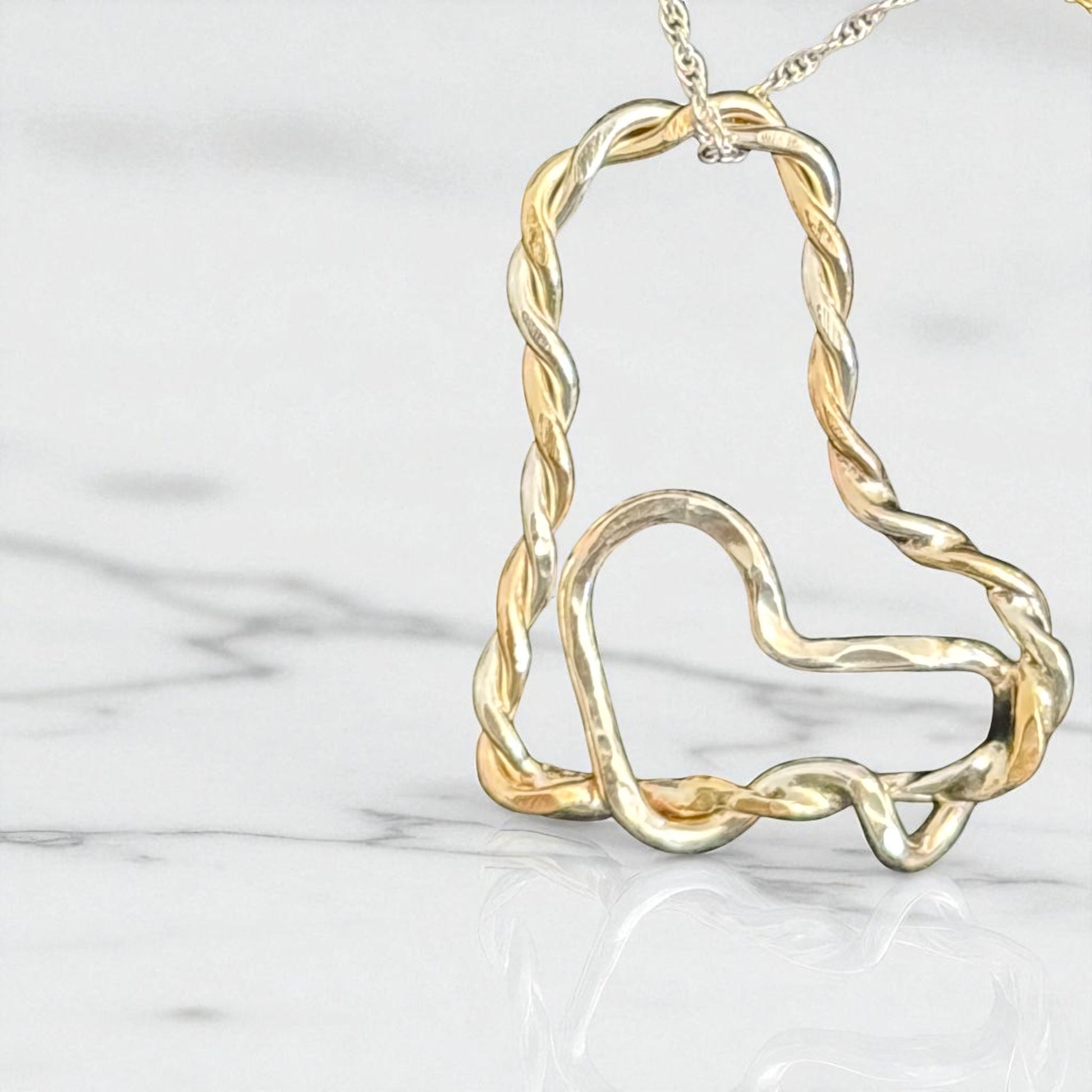 This handcrafted heart necklace is made of twisted sterling silver and Gold Filled wires woven together with a hammered silver small heart embracing the other. It's a small piece of jewelry with a beautiful 24" sterling silver rope chain.