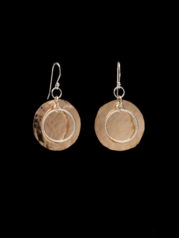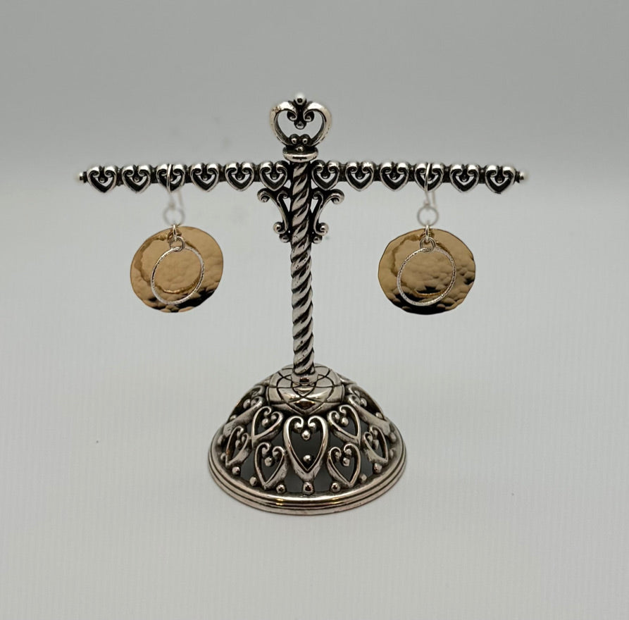 Handcrafted Hammered Gold-Filled Disc earrings with sterling silver diamond cut hoop for brilliance and shine.