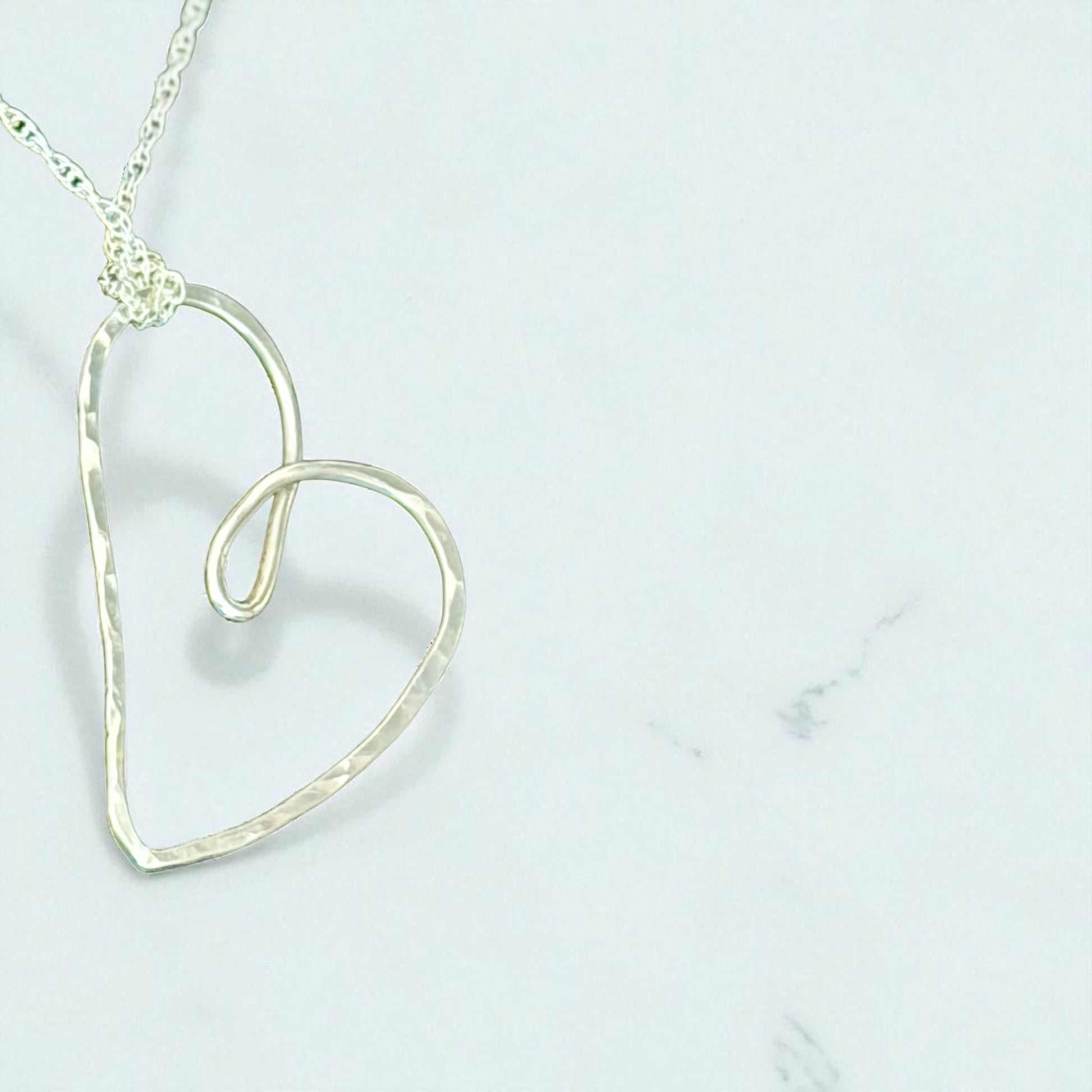 The Love and Friendship Heart in hammered Sterling Silver necklace in a uniquely beautiful design with an elongated lobe and gentle curves shining brilliantly.