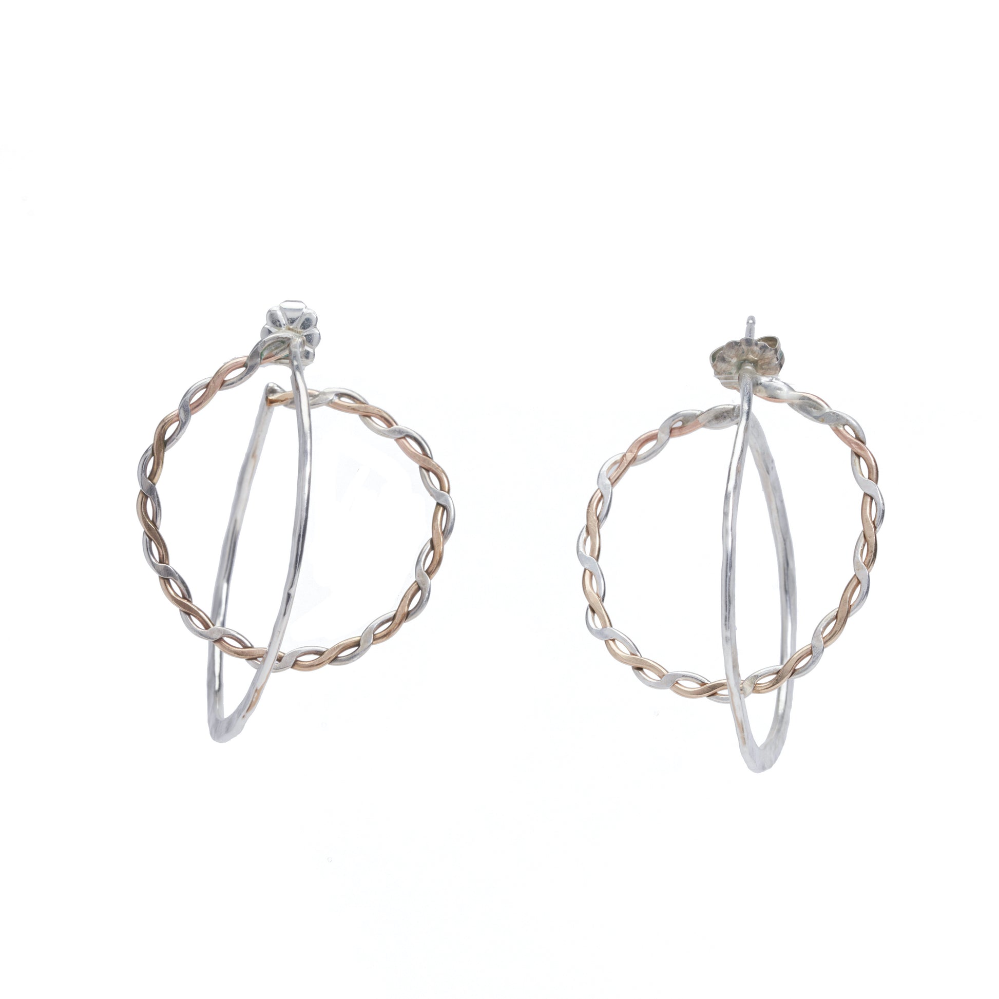 Handcrafted Spherical shaped earrings with one hoop in twisted gold-fill and silver and the other in hammered sterling silver. These earrings are on a post with backs.